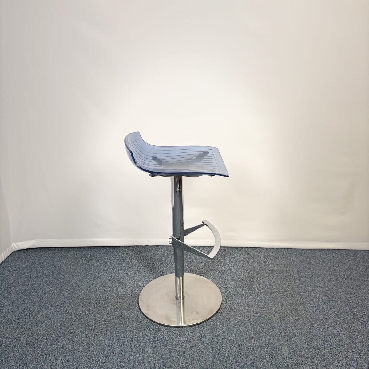 Tabouret en plastique bleu avec repose pieds en metal