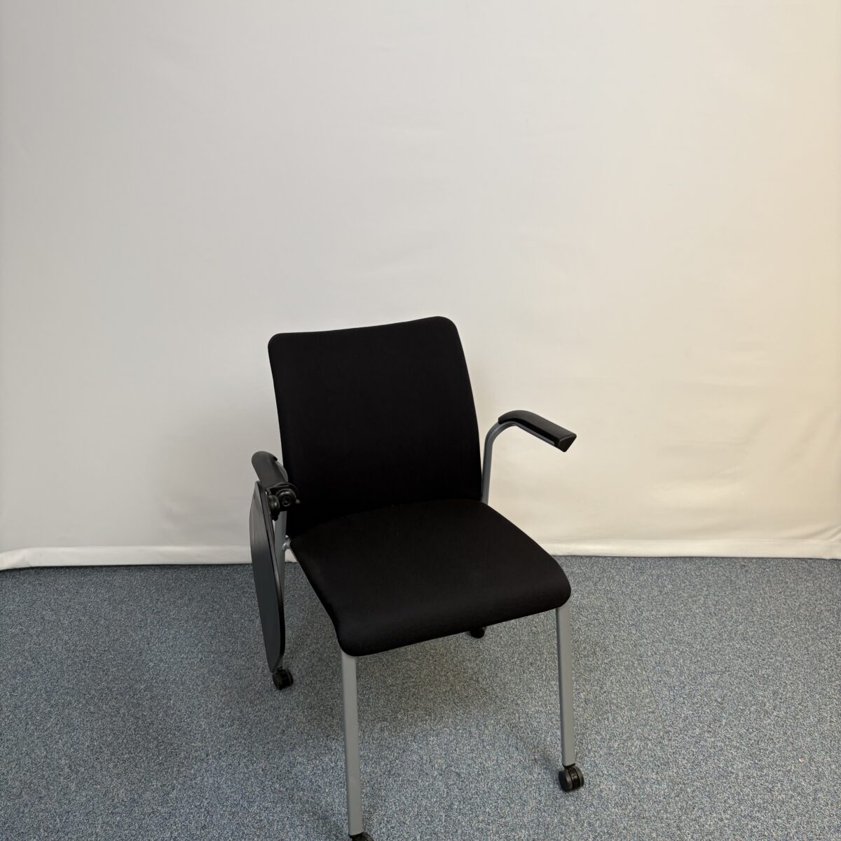 Ce siège est conçu avec une coque en plastique résistant, un dossier et une assise rembourrés en tissu noir de qualité, une tablette d’écriture rabattable et un piètement à roulettes. Ce design multifonction rend ce modèle particulièrement utile pour les réunions, les sessions de formation ou les environnements dynamiques où les utilisateurs ont besoin d’écrire, de prendre des notes, ou de se déplacer facilement.