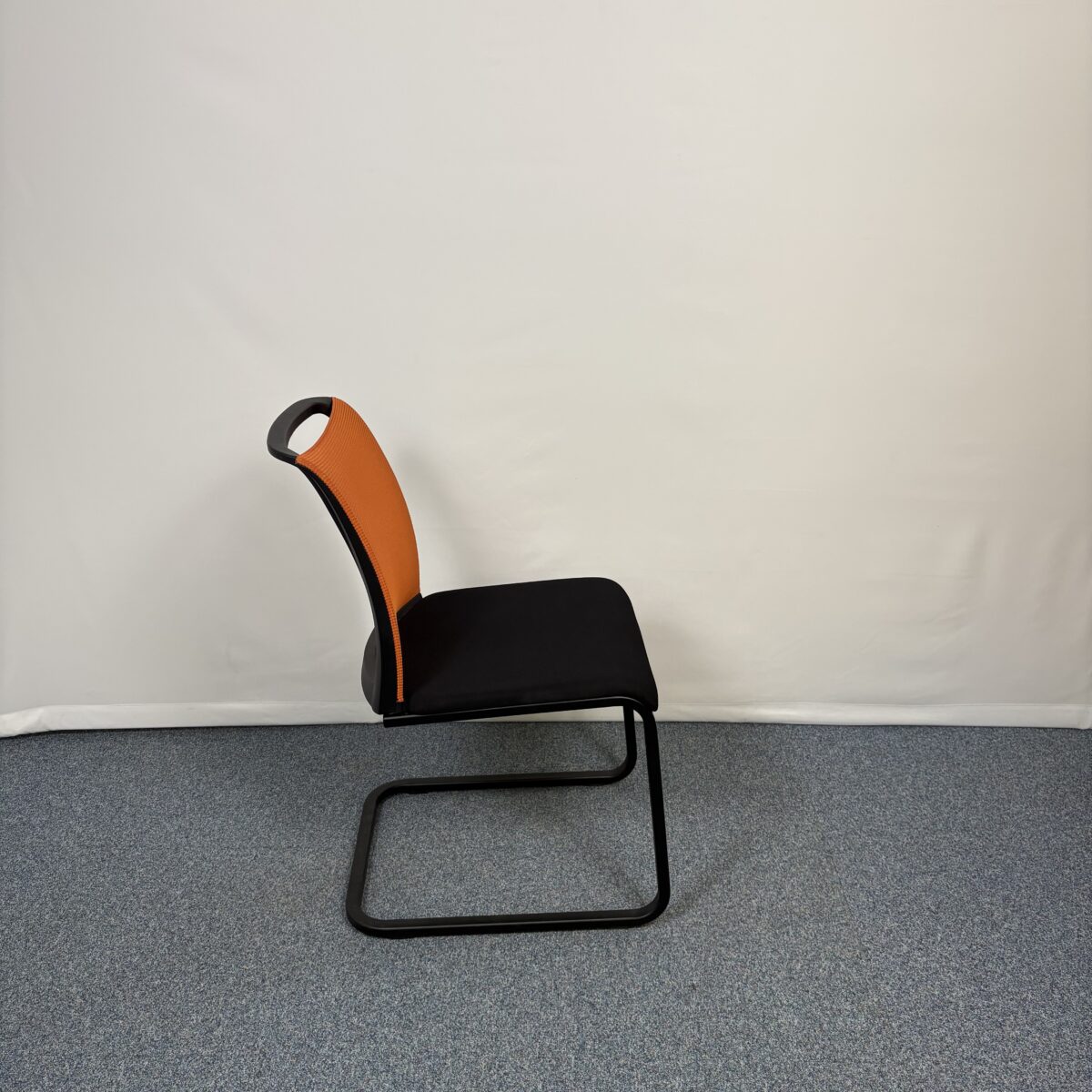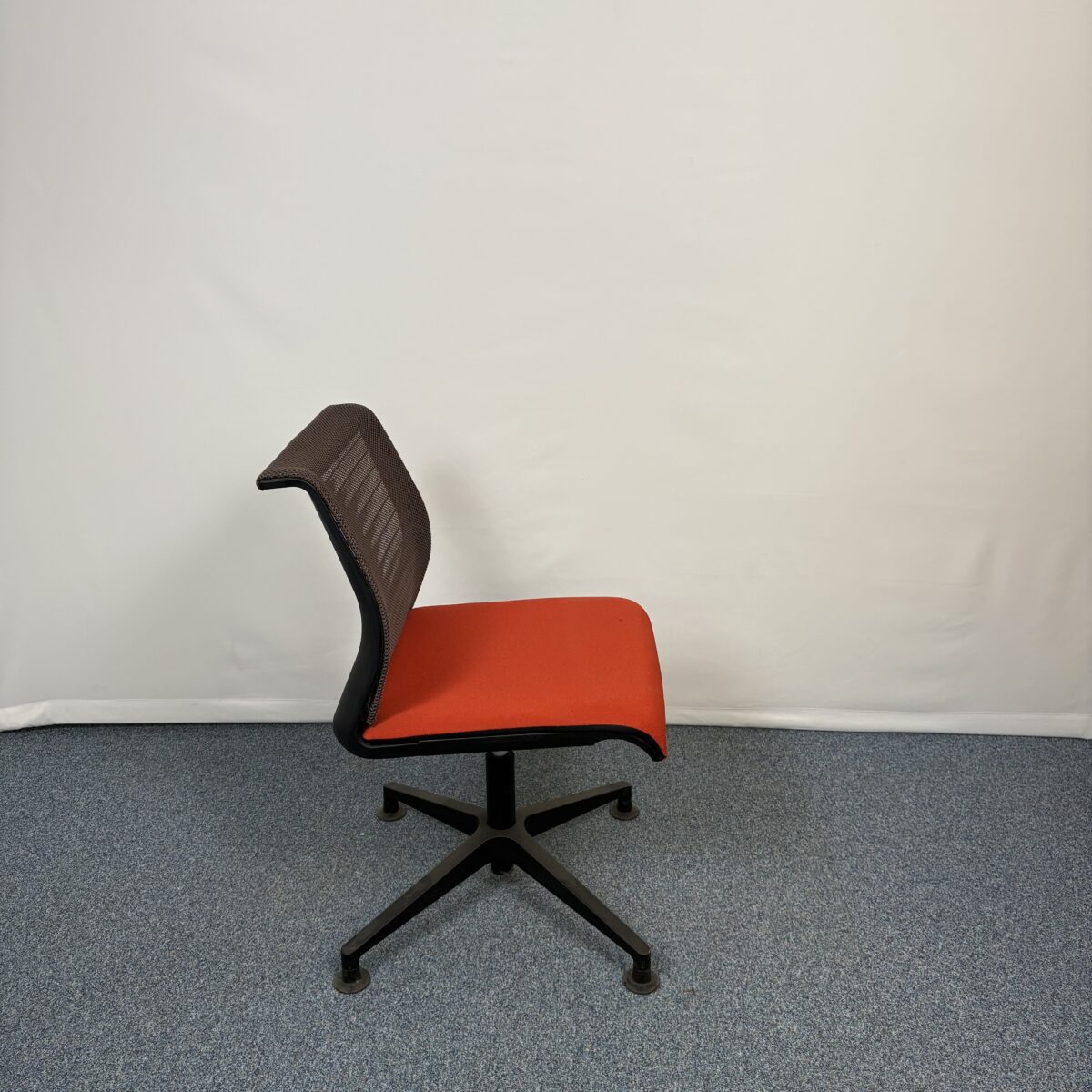 La Steelcase Reply est immédiatement reconnaissable grâce à son dossier en résille orange très aéré, associé à une assise noire rembourrée. Cette palette de couleurs crée un contraste visuel fort : l’orange apporte une touche de dynamisme et de modernité, tandis que le noir assure l’élégance et la sobriété. Le design général est à la fois minimaliste et raffiné, offrant une esthétique professionnelle qui convient aussi bien aux salles de réunion qu’aux espaces de réception.