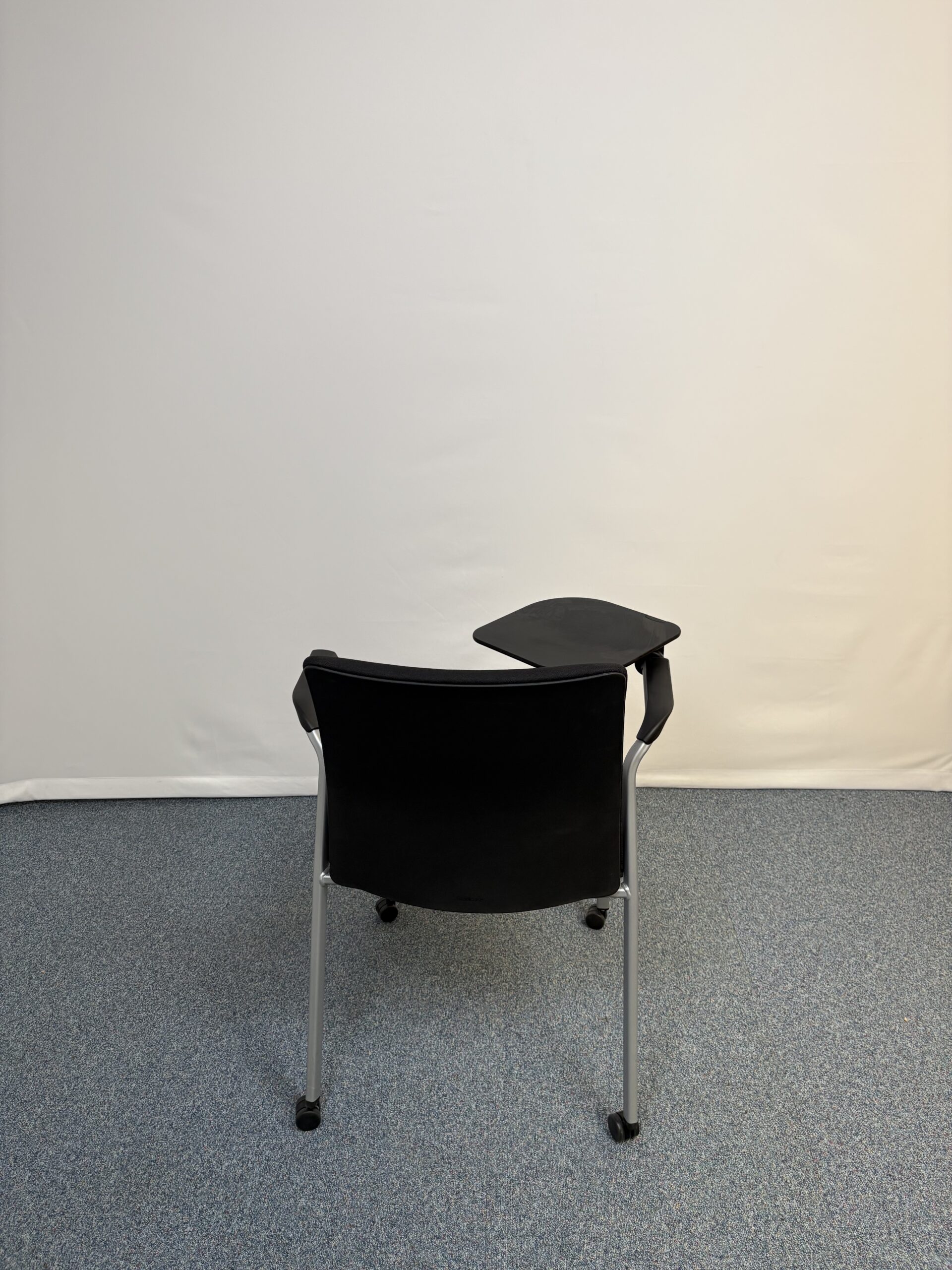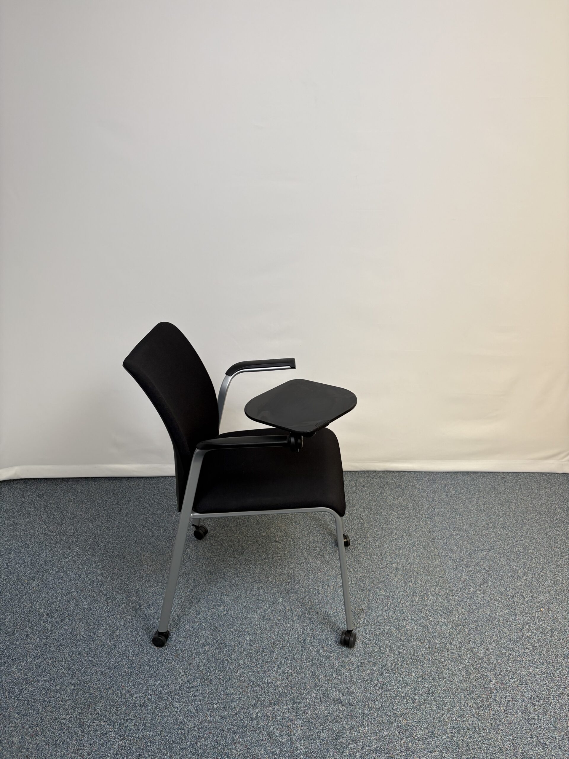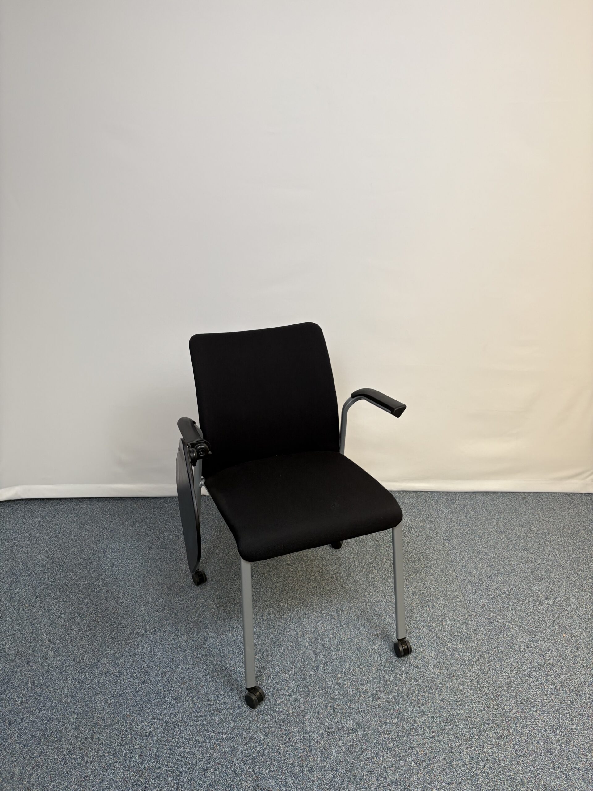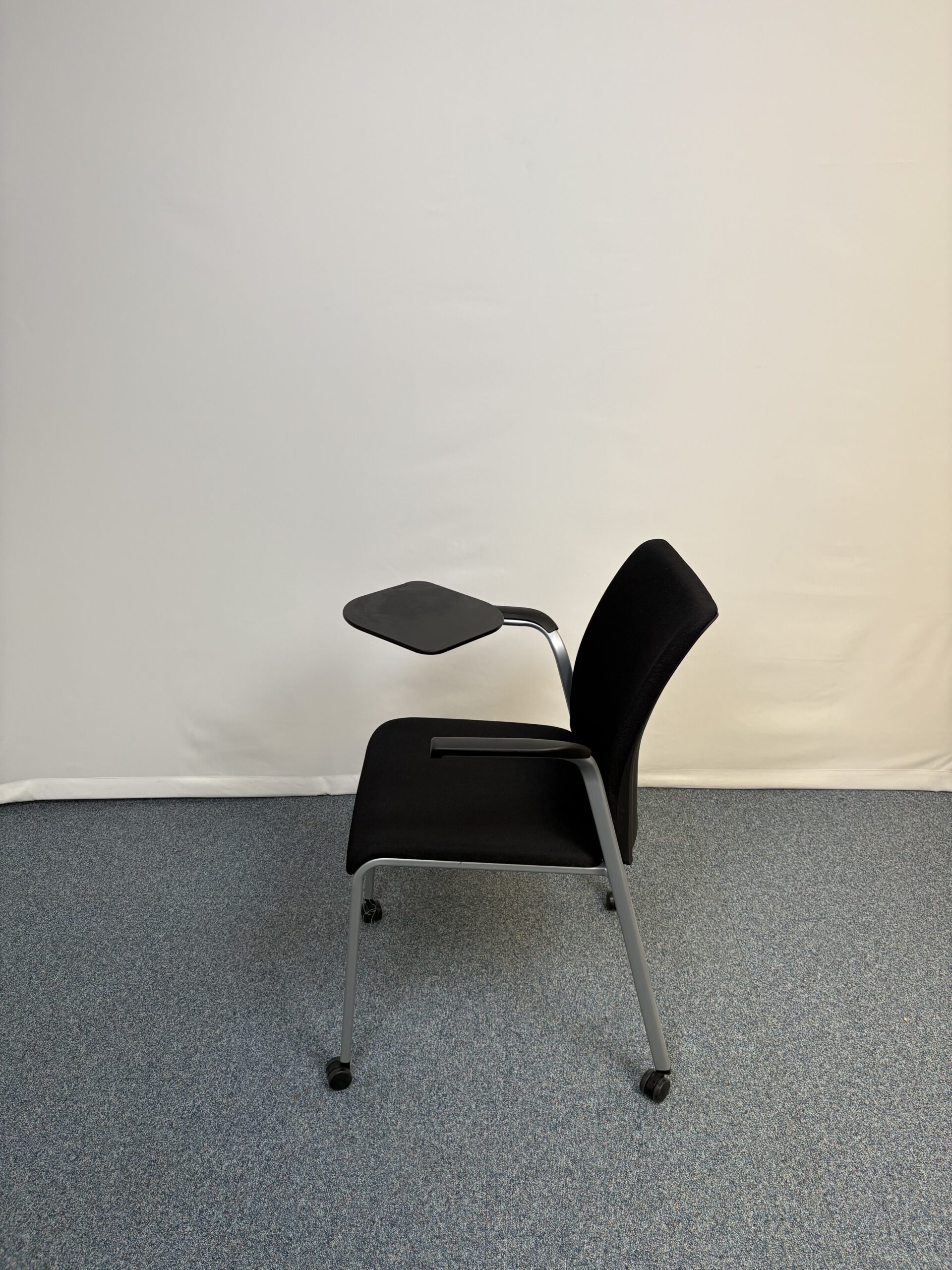 Siège de réunion en plastique et tissu noir avec tablette et roulettes