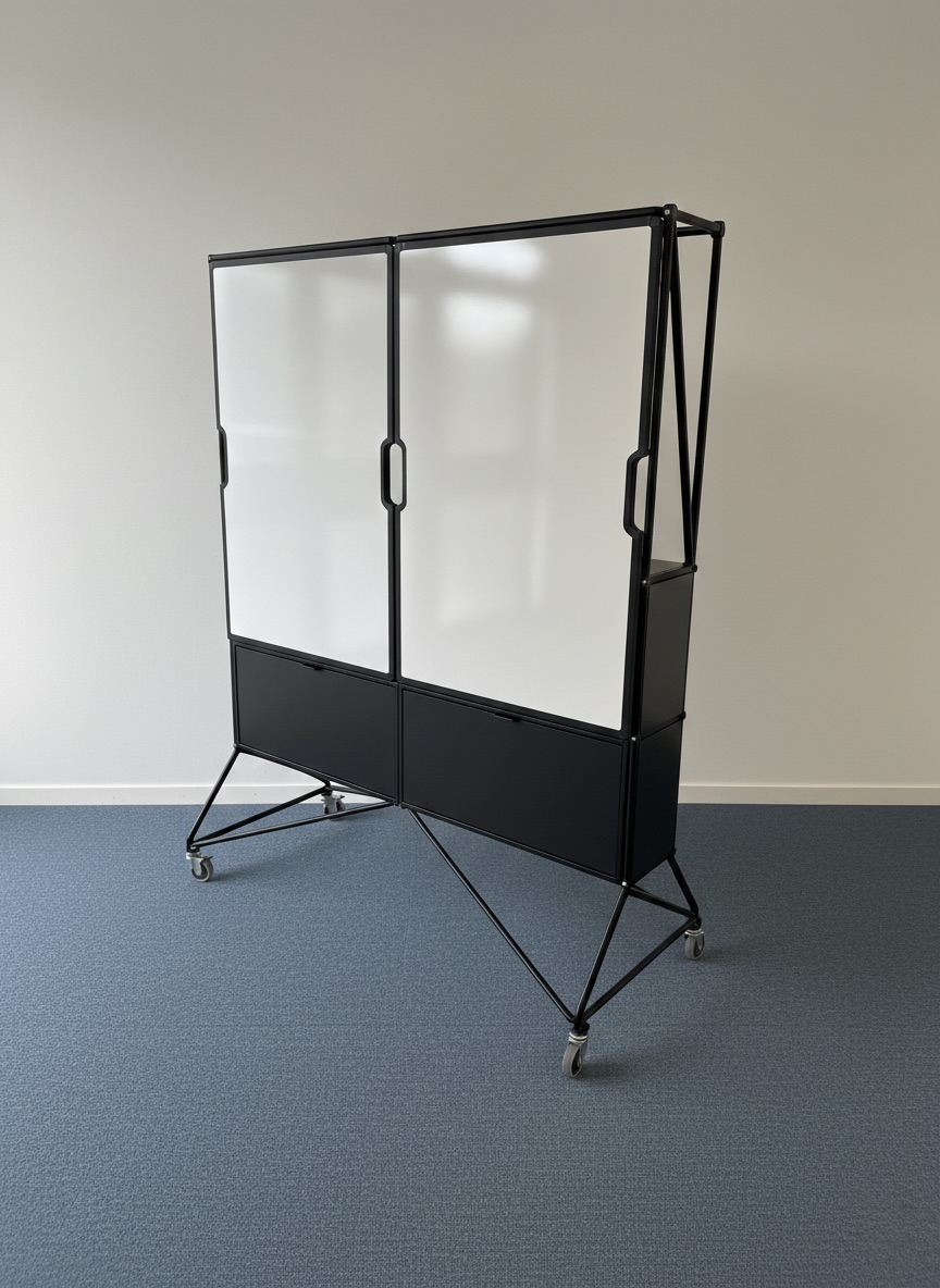 La conception d’un support de tableau sur roulettes avec rangements repose sur un équilibre parfait entre stabilité et légèreté. La structure, généralement fabriquée en acier ou en aluminium haute résistance, est conçue pour supporter le poids de tableaux de grandes dimensions sans jamais vaciller. La base est souvent élargie pour abaisser le centre de gravité, garantissant que le déplacement du mobilier se fasse en toute sécurité, même lorsque les rangements sont pleins. Cette robustesse est essentielle pour assurer la longévité du produit dans un cadre professionnel où les manipulations sont quotidiennes et parfois brusques.